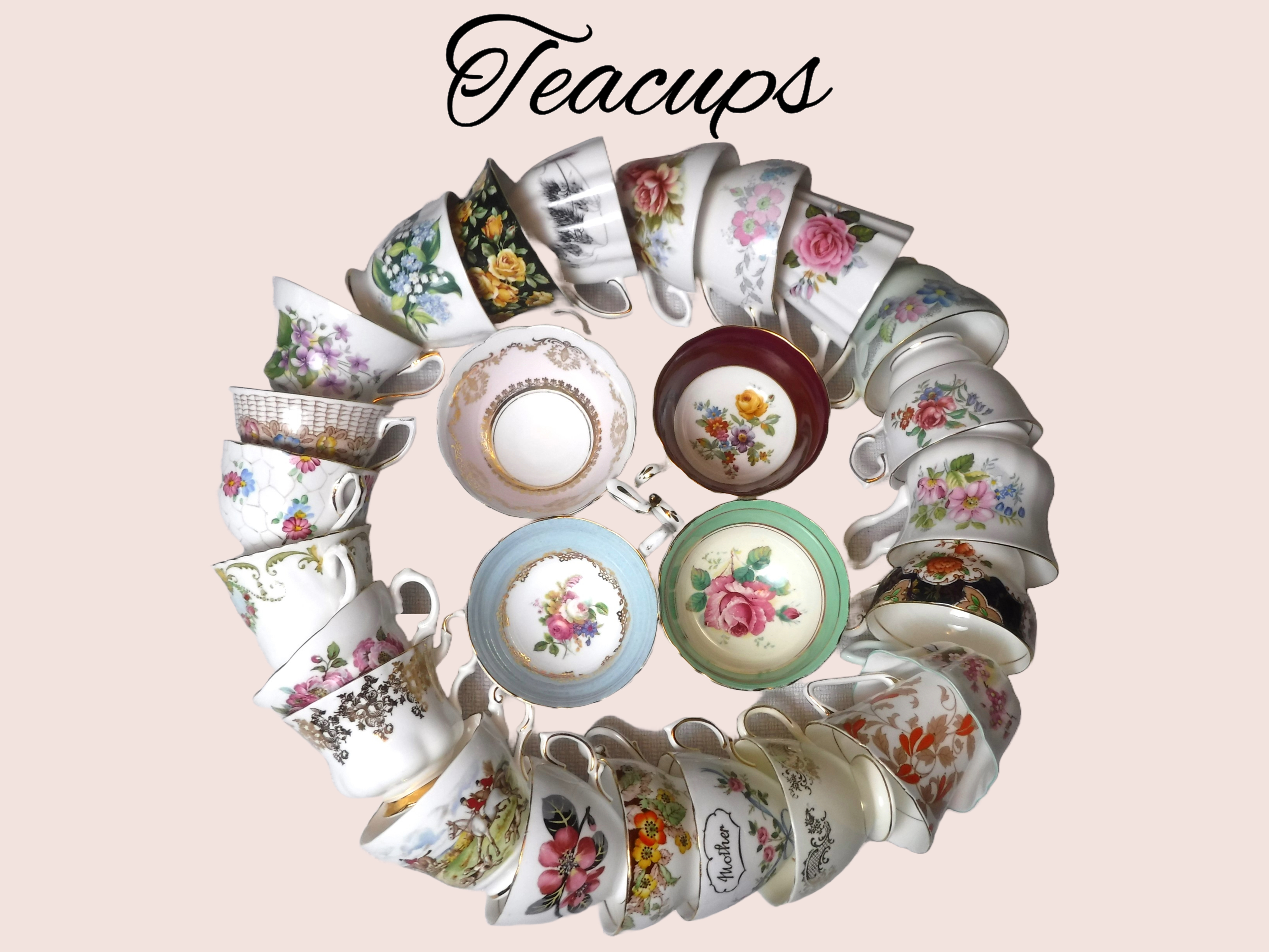Vintage bone china teacups and saucers all made in England. Beautiful, elegant teacups and saucers with choices of matching, mismatched, imperfect or bulk sets in various colours, shapes and patterns. One set is one teacup and one saucer. Single pieces are also available if a set is not needed. Perfect for tea parties and bridal showers!